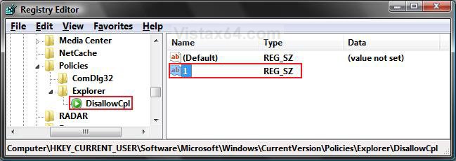 A) In the right pane of Explorer, right click on DisallowCpl and click on Delete. (See screenshot below step 5)