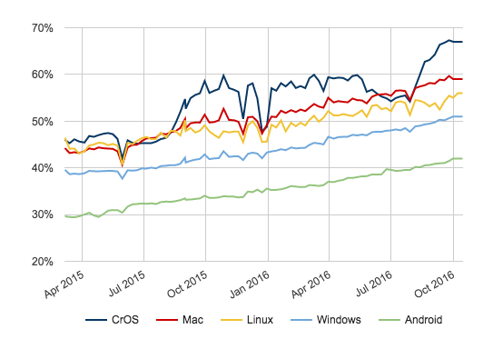 Today, we’re adding a new section to the HTTPS Report Card in our Transparency Report that includes data about how HTTPS usage has been increasing over time. More than half of pages loaded and two-thirds of total time spent by Chrome desktop users occur via HTTPS, and we expect these metrics to continue their strong upward trajectory.
