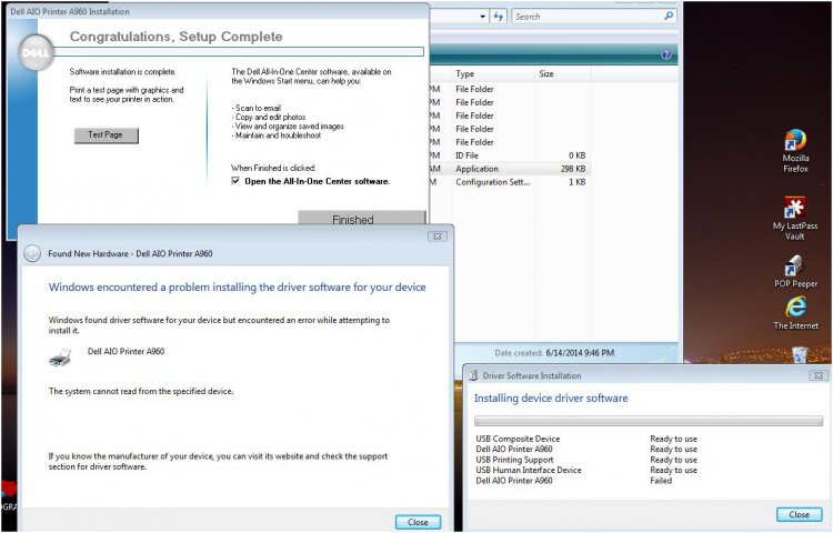 I'm going to try the simple steps one more time today, and that is shutting down the printer and computer and unplugging both and then pressing the start buttons to defuse them, or whatever it would be called -- reseat my print cartridges again, plug everything back in and see if it works. Then I'm going to make a decision on a printer. I also have a 17.5" Toshiba laptop that I can't use this Dell A960 with. Lots of people have been trying to hook this printer up on Windows 7 computers and having no luck and guess no drivers for Windows 7 were ever issued so everyone is trying work-arounds.