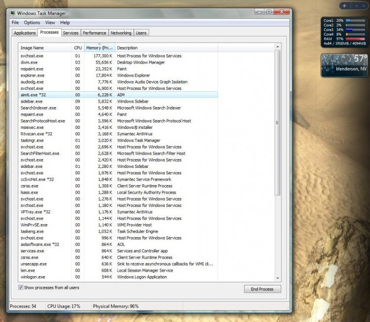 Another example, which particularly affects Vista, is one process hogging the processor and slowing down all the other applications. Adding more memory to systems that already have 2Gb of RAM is not the best course of action. Better would be to troubleshoot which program or driver is running out of control, and fix that problem. Likely culprits are rogue drivers from hardware designed for XP, and antiquated anti-virus software trying to update their .dat files. For a solution, start with Task Manager, Process tab, add sort the Images on the CPU column.