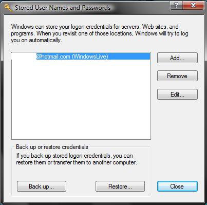 A) Click on the User Accounts icon and click on the Manage your network passwords link in the upper left corner. (See screenshot below)