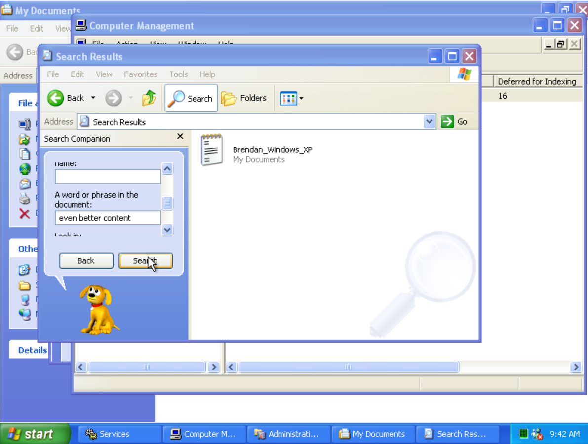 Above shows content indexing in action on Windows XP. “even better content” is a sentence in the text file Brendan_Windows_XP.txt.