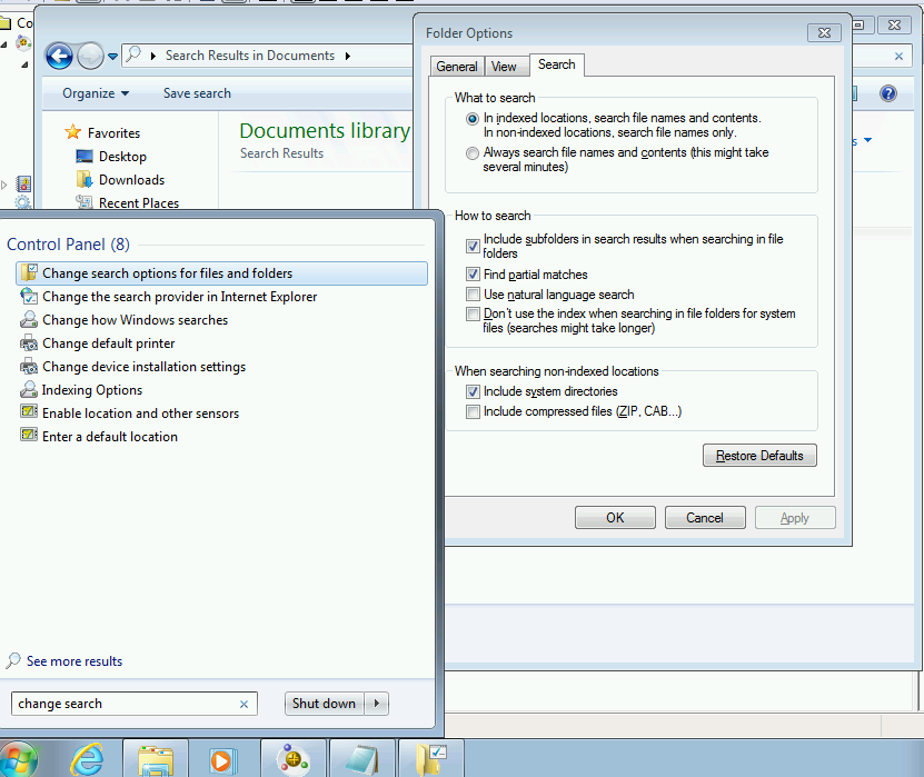 Most of the indexing features of Windows Vista went straight into Windows 7. By default, the indexing service indexed all files and folders under your user profile, but it did not index contents of all the files on your machine. This was something had to be turned on by the user. There was a new dialog in the Control Panel named Change search options for files and folders that you could use to fine tune how search worked on your machine. This directly impacted the behavior of the indexing service and how it handled your files.