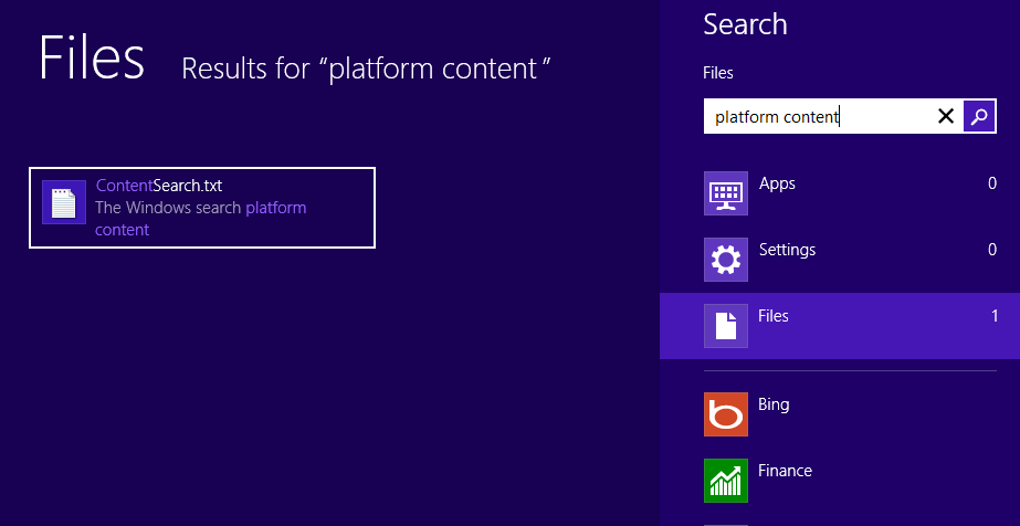 Unlike Windows 7, in Windows 8 the indexing of the content of your files in your user profile was turned on by default. Searching was very easy in Windows 8 as you could just start typing and it would automatically enter in your criteria and search across settings files and apps all at the same time.