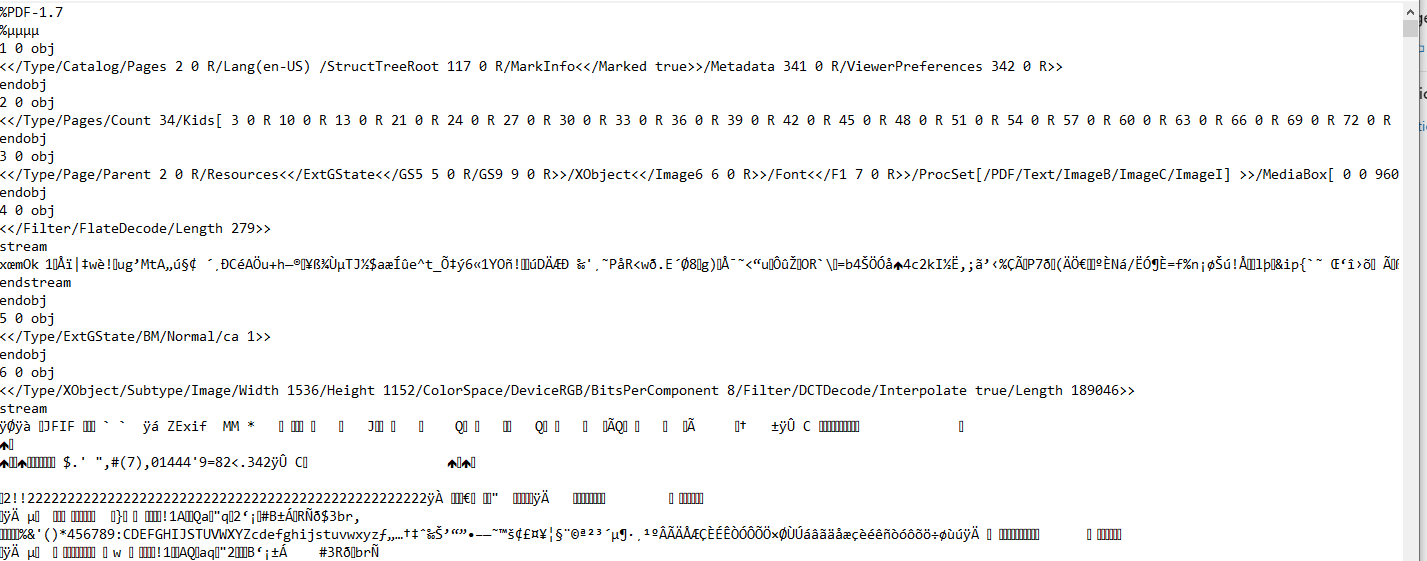 Blindly opening a file like the above is not a very useful way to process this data for the purpose of searching, nor does it make much sense to me. This is what the indexing service would see to extract data from without the appropriate filter. Filters became a way for a specific file format to communicate the data in that file that is valued as searchable. With an IFilter for .pdf files, sentences of text, properties, and metadata within the file are returned and stored in the indexing service – the meaningful, searchable data the user cares about.