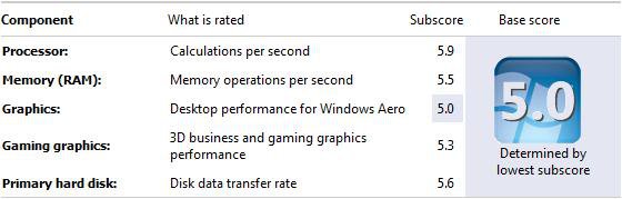 ComponentDetailsSubscoreBase scoreProcessorIntel(R) Core(TM)2 Quad CPU Q6600 @ 2.40GHz5.95.6 Determined by lowest subscoreMemory (RAM)8.00 GB5.9GraphicsNVIDIA GeForce 8800 GT 5.9Gaming graphics3070 MB Total available graphics memory5.9Primary hard disk74GB Free (149GB Total)5.6Windows Vista (TM) Ultimate